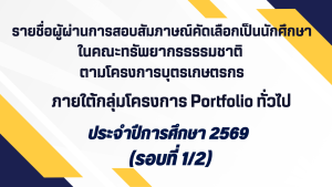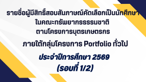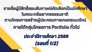 รายชื่อผู้มีสิทธิ์สอบสัมภาษณ์คัดเลือกเป็นนักศึกษาในคณะทรัพยากรธรรมชาติ ตามโครงการบุตรเกษตรกร ภายใต้กลุ่มโครงการ Portfolio ทั่วไป ประจำปีการศึกษา ๒๕๖๙ (รอบที่ ๑/๒) รายชื่อผู้มีสิทธิ์สอบสัมภาษณ์คัดเลือกเป็นนักศึกษาในคณะทรัพยากรธรรมชาติ ตามโครงการบุตรเกษตรกร ภายใต้กลุ่มโครงการ Portfolio ทั่วไป ประจำปีการศึกษา ๒๕๖๙ (รอบที่ ๑/๒) Read More »