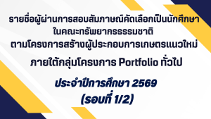 รายชื่อผู้ผ่านการสอบสัมภาษณ์และได้รับคัดเลือก เป็นนักศึกษาในคณะทรัพยากรธรรมชาติ มหาวิทยาลัยสงขลานครินทร์ ตามโครงการสร้างผู้ประกอบการเกษตรแนวใหม่ภายใต้กลุ่มโครงการ Portfolio ทั่วไป ประจำปีการศึกษา ๒๕๖๙ (รอบที่ ๑/๒) รายชื่อผู้ผ่านการสอบสัมภาษณ์และได้รับคัดเลือก เป็นนักศึกษาในคณะทรัพยากรธรรมชาติ มหาวิทยาลัยสงขลานครินทร์ ตามโครงการสร้างผู้ประกอบการเกษตรแนวใหม่ภายใต้กลุ่มโครงการ Portfolio ทั่วไป ประจำปีการศึกษา ๒๕๖๙ (รอบที่ ๑/๒) Read More »