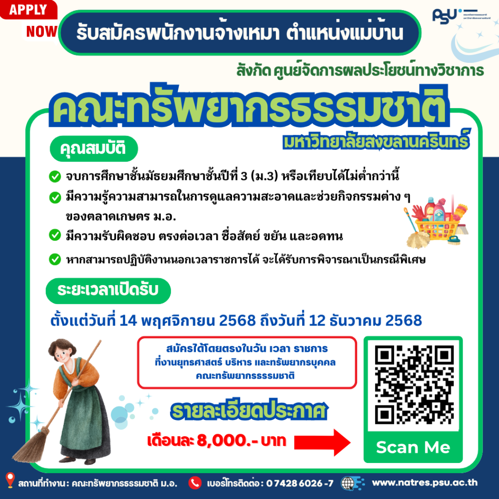 ประกาศรับสมัครพนักงานจ้างเหมา ตำแหน่งแม่บ้าน จำนวน 1 อัตรารับสมัครงาน / 14/11/2025 วันที่เปิดรับสมัครถึง 12 ธ.ค.2568 ประกาศพนักงานจ้างเหมา ตำแหน่งแม่บ้านดาวน์โหลด