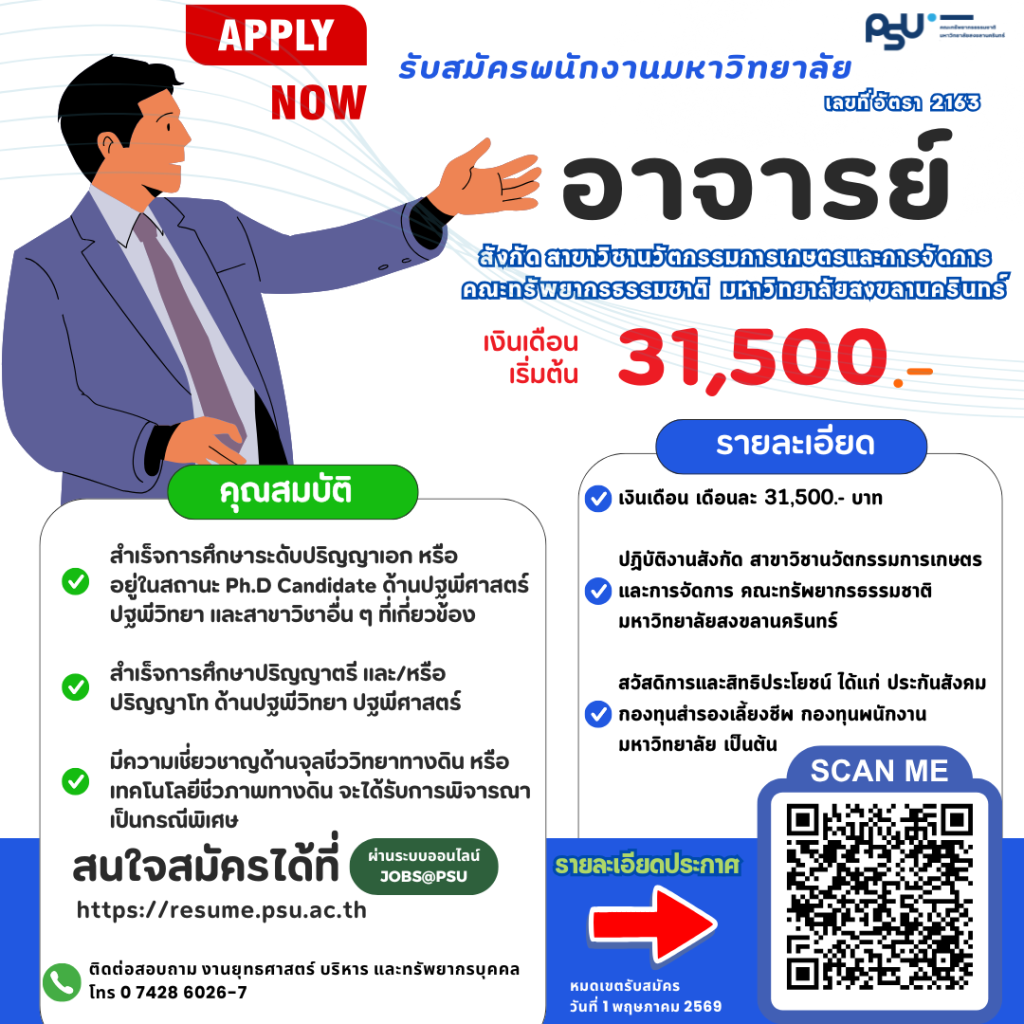 ประกาศรับสมัครพนักงานมหาวิทยาลัย ตำแหน่งอาจารย์ เลขที่อัตรา 2163 จำนวน 1 อัตรารับสมัครงาน / 27/02/2026 วันที่เปิดรับสมัครถึง 1 พ.ค.69 ประกาศนวัตกรรมการเกษตร 2163ดาวน์โหลด