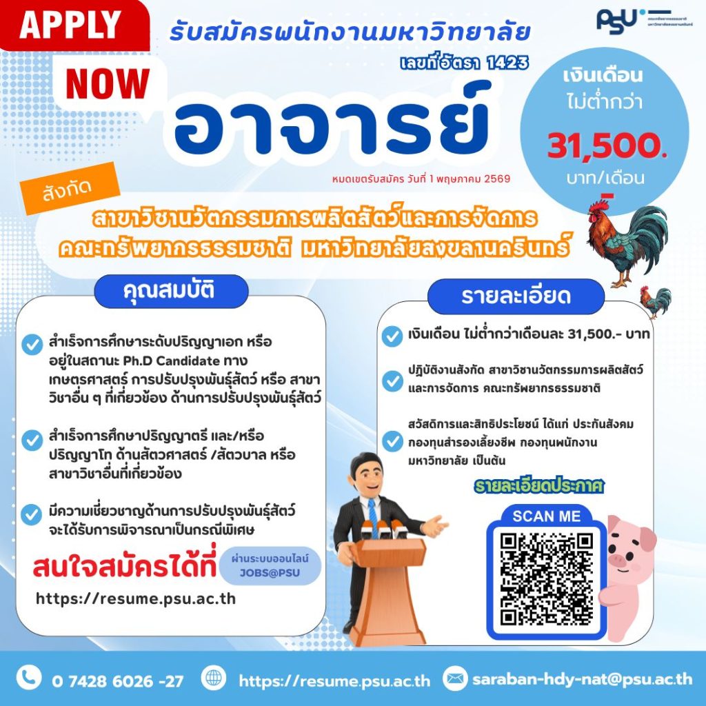 ประกาศรับสมัครพนักงานมหาวิทยาลัย ตำแหน่งอาจารย์ เลขที่อัตรา 1423 จำนวน 1 อัตรารับสมัครงาน / 10/03/2026 วันที่เปิดรับสมัครถึง 1 พ.ค.69 ประกาศรับสมัครอาจารย์ 1423ดาวน์โหลด